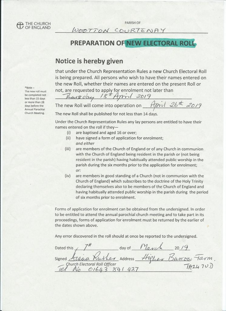 Diana Rusher would like to give notice that you have until April 18th to complete the application form (also below) to join the parish electoral role. Voters are then enabled to vote on Parish matters as requested by the Parish Council.