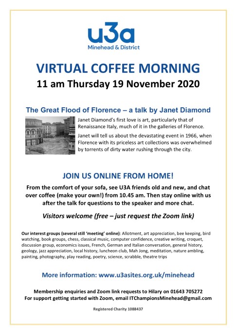I wonder if any Wootton Courtney folk interested in art and/or Florence might like to join us as visitors for this virtual coffee morning on Thursday this week, when Janet Diamond will be talking about the Great Flood of Florence in 1966.