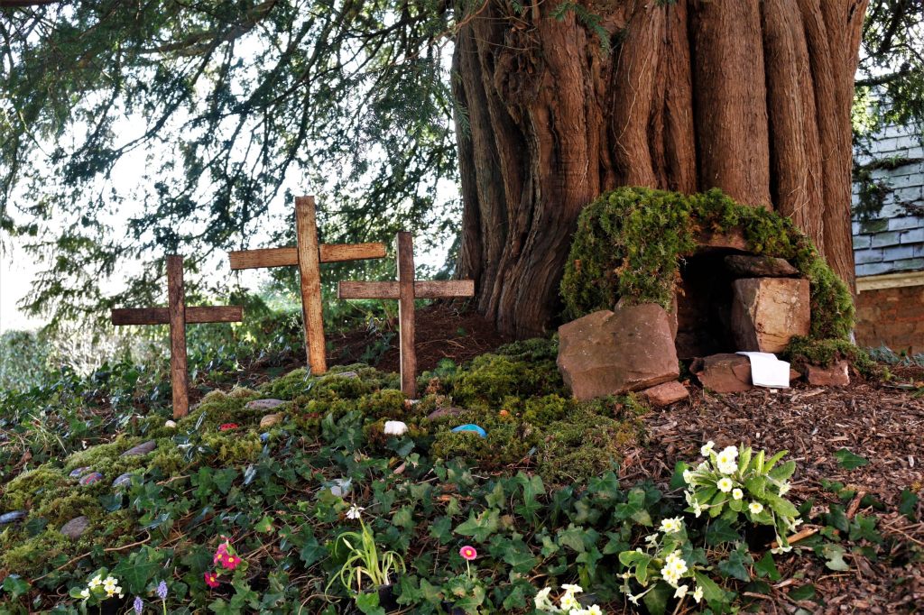 For those who weren’t able to see it, this photo is of the Easter garden at the foot of the yew tree in All Saints’ churchyard, Wootton Courtenay. Sunday’s fine weather saw a well-attended outdoor service in the churchyard, conducted by Bishop Brian Castle, who stressed the traditional Easter message of hope and regeneration, a particular need in the present troubled times.