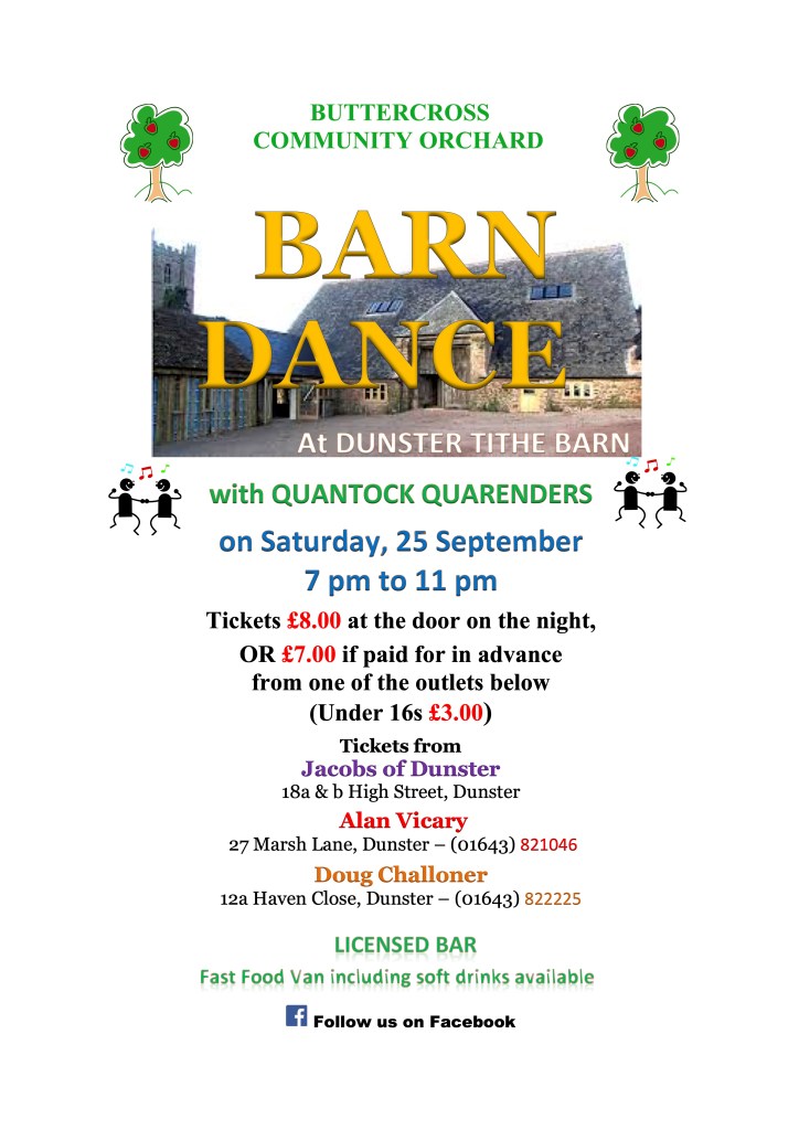Barn Dance in Dunster Buttercross Community Orchard are holding a Barn Dance at the Tithe Barn in Dunster next Saturday – see below for details. Share this: Click to email a link to a friend (Opens in new window) Email Click to share on Facebook (Opens in new window) Facebook Click to print (Opens in new window) Print More Click to share on X (Opens in new window) X Click to share on WhatsApp (Opens in new window) WhatsApp Click to share on Pinterest (Opens in new window) Pinterest Click to share on LinkedIn (Opens in new window) LinkedIn Click to share on Reddit (Opens in new window) Reddit Click to share on Pocket (Opens in new window) Pocket Related Published by Marion Jay View all posts by Marion Jay