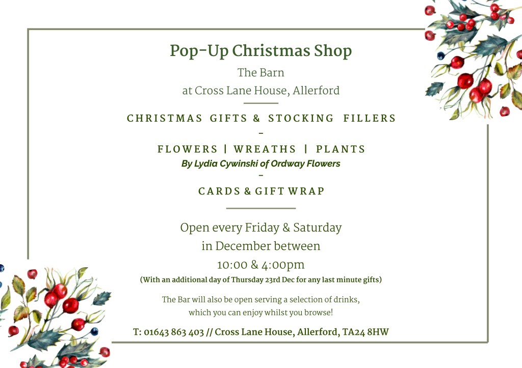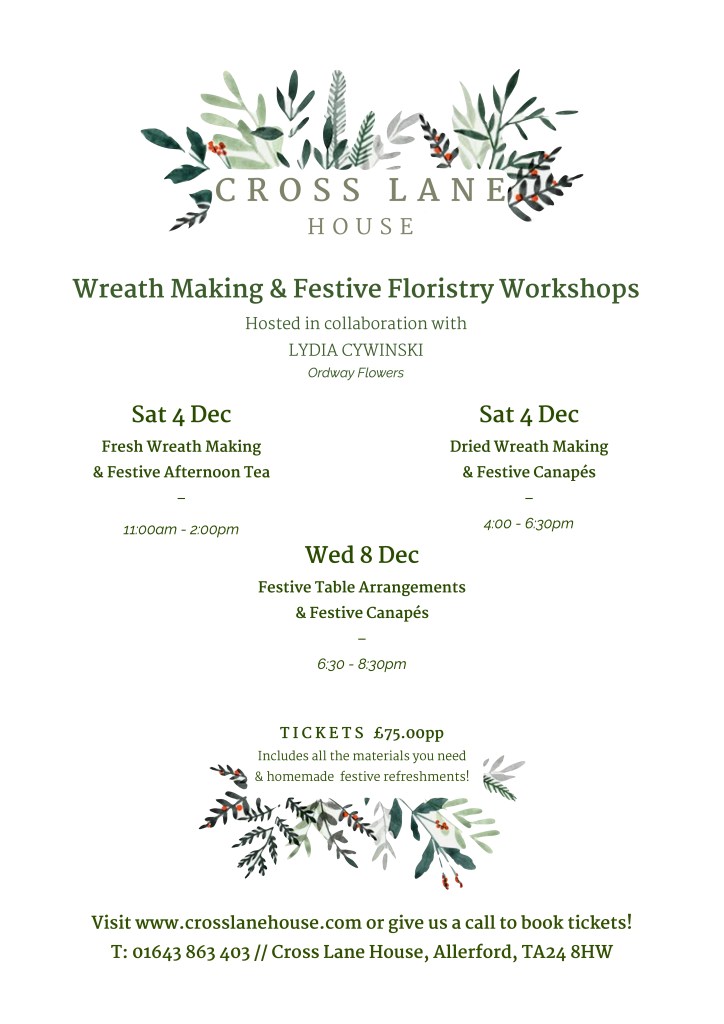 Lydia Cywinski is running a pop-up Christmas shop and festive floristry sessions in Allerford this December. Lydia ran a successful flower shop and wedding business in Edinburgh before moving to Minehead to follow her dream of growing her own flowers to use in arrangements. She also runs Heirloom Silk, a business specialising in hand dyeing silk ribbons with natural plant dyes. Book now to join Lydia in making a beautiful wreath or table arrangement as the festive season approaches.