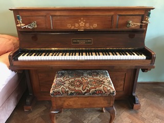 A beautiful piece of furniture and still in very good condition. Makers: John Broadwood & Sons, London. Includes stool.