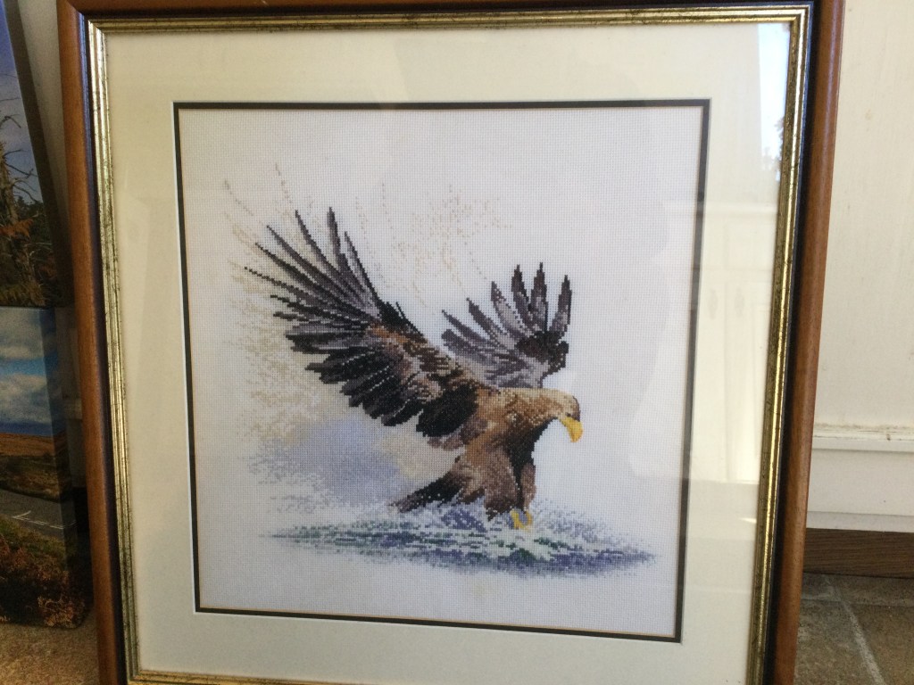 - Cross stitch picture of a white tailed eagle, framed.