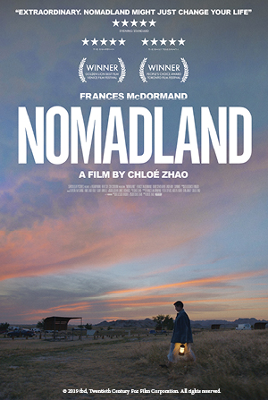 Following the economic collapse of a company town in rural Nevada, Fern (Frances McDormand) packs her van and sets off on the road exploring a life outside of conventional society as a modern-day nomad. The third feature film from director Chloé Zhao, NOMADLAND features real nomads Linda May, Swankie and Bob Wells as Fern’s mentors and comrades in her exploration through the vast landscape of the American West