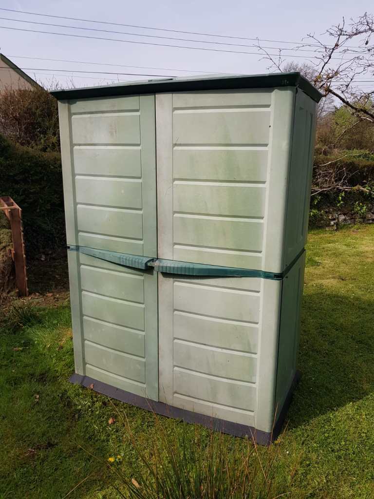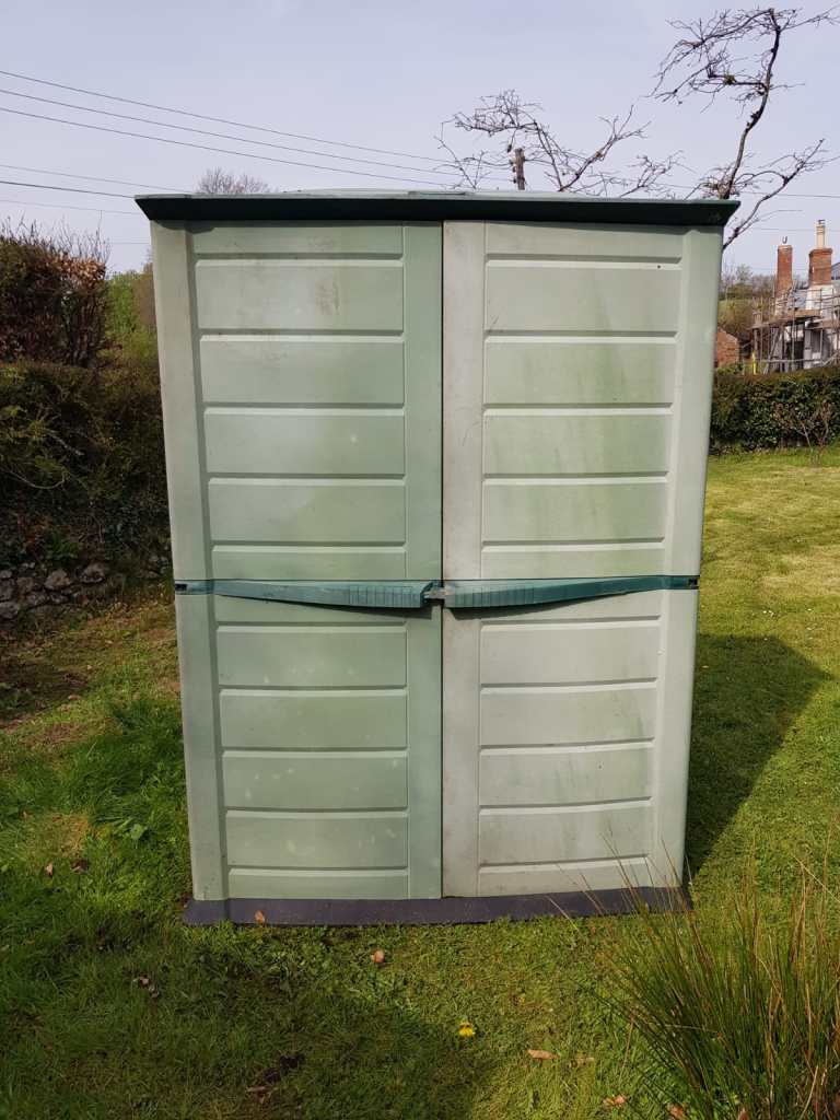 Suitable for storing garden tools or logs, it is 6’3” high x 4’9” wide x 2’3” deep (192 x 144 x 80 cm). There are 2 doors, each 6’ high and 2’4” wide (183 x 72 cm). It is in sections which take apart, but would need a pick-up or trailer for transport. It has seen better days, but may be useful to someone. It is currently located in Huntscott, where it can be viewed.