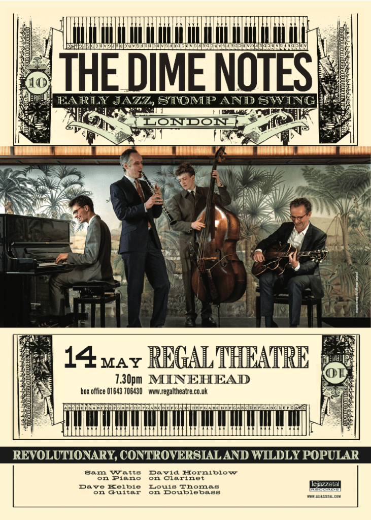 London’s most stylish vintage jazz band The Dime Notes come to the Minehead Regal on Saturday May 14 at 7.30pm with an upbeat, feel-good celebration of the irresistible, foot-tapping early jazz of the 1920s. The joyously engaging band will be digging back into the blues-drenched sounds of clarinet-driven New Orleans jazz, unearthing a repertoire of stomps, blues, and forgotten gems of the era from musicians such as Johnny Dodds, Jelly Roll Morton and Red Nichols.