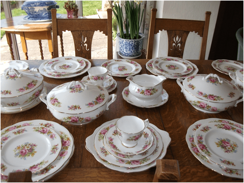 A large Royal Albert bone china dinner service, believed to be from the 1940s. This is a beautiful classic service in the rare pattern of ‘Chatsworth’, charmingly decorated with forget-me-nots and roses. There is a lot of it and it could possibly be suitable to split. This service is very old and I think it is only fit for display. It certainly would not be safe in a dishwasher. It has been stored away in a dresser cupboard until now.