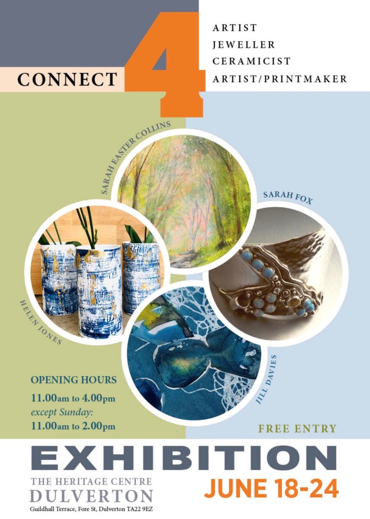 Helen Jones and Sarah Fox are getting together with two other talented local artists for an exhibition in Dulverton, and would love to see you there. If you’re thinking of coming over, why not get together with friends, have a car share and make it a day out? Dulverton is a beautiful village and there are some great restaurants there, too.
