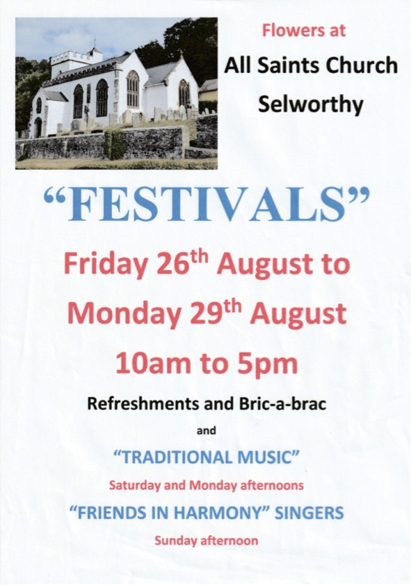 The Flower Festival at Selworthy Church will be held from 26th – 29th August. All are warmly invited to come and view the floral displays, and stop to enjoy the lovely teas on offer in a relaxed atmosphere. Traditional music will be performed on Saturday and Monday at 2.00pm and 3.30pm, and there will be songs from ‘Friends in Harmony’ on Sunday at 2.30pm.