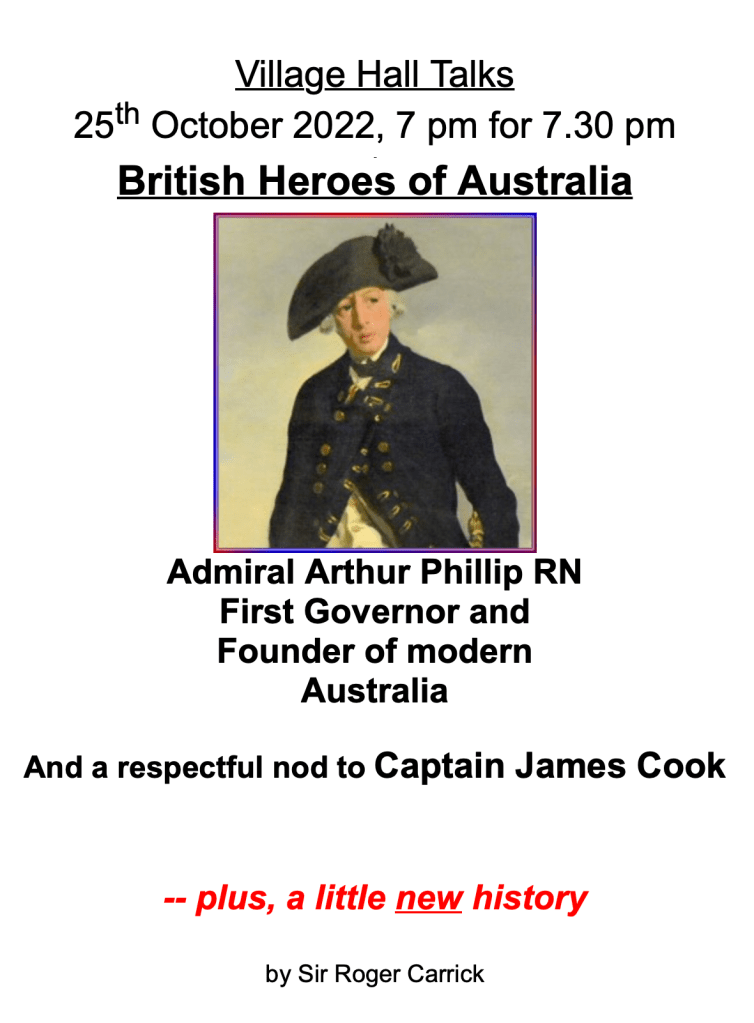 For the first of these, on 25th October, Sir Roger Carrick will speak about two British heroes of Australia: Admiral Arthur Philip, the first Governor and founder of Australia, and Captain James Cook, who discovered what became known as Australia.