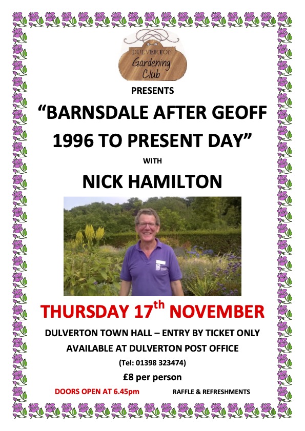 Nick Hamilton trained in horticulture at Writtle College, and when he took over the running of Barnsdale Gardens after his father Geoff died, he developed it into the inspirational garden that it is today. Over the years, Nick has also made appearances on Gardeners’ World, written books, and tutored most of the courses being run at Barnsdale. Tickets for the talk are available from Dulverton Post Office.