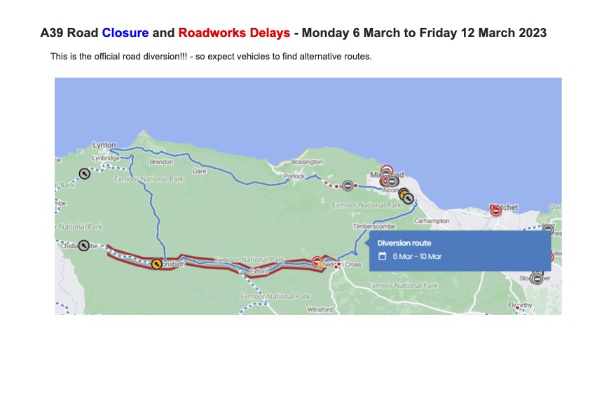The A39 will be closed for 5 days from 6th March between Headon Cross at the end of Bratton Straight, and Venniford Cross at the bottom of the hill. See diversion map below.