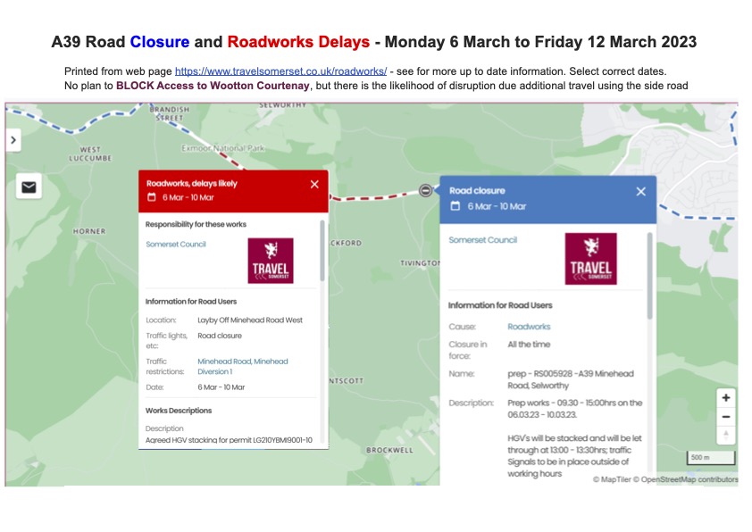 Somerset County Council’s website provides detailed information: https://www.travelsomerset.co.uk/roadworks/ The relevant dates have to be selected to bring up the correct information.