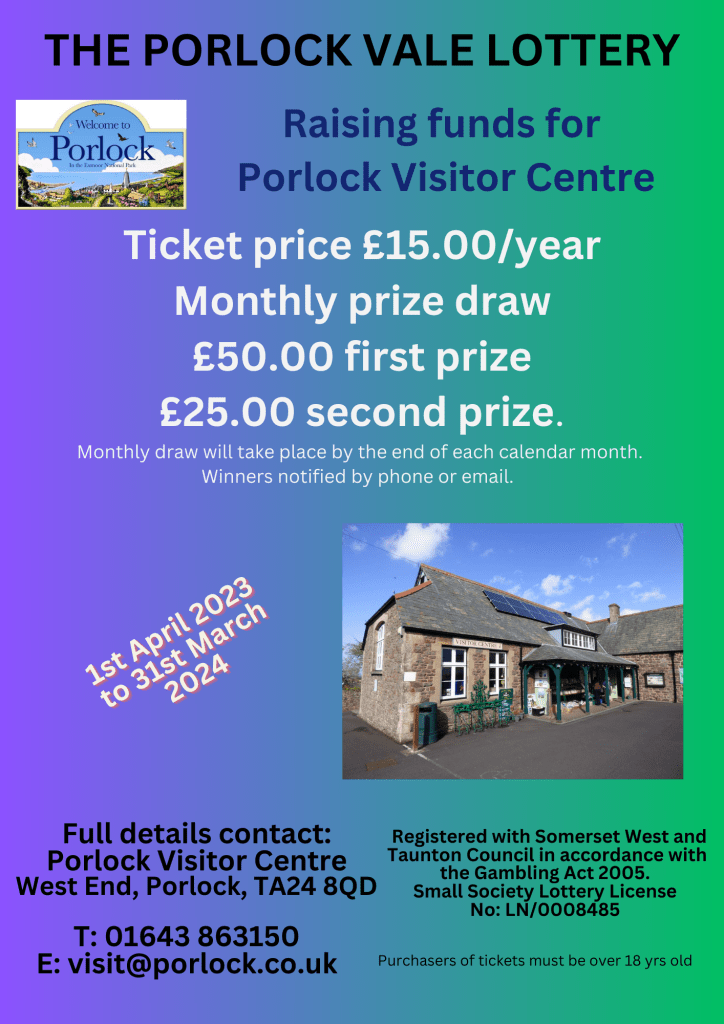 Porlock Visitor Centre is launching the Porlock Vale Lottery, giving ticket buyers the chance to win a prize each and every month. The lottery is a fund-raising scheme to help secure the Centre’s future and give back to the community at the same time.