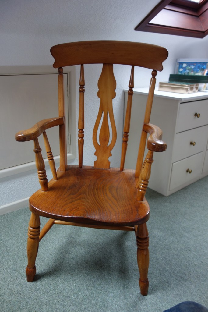 Windsor armchair, pre-1900. Beech with elm seat and arms (see photo below). £50