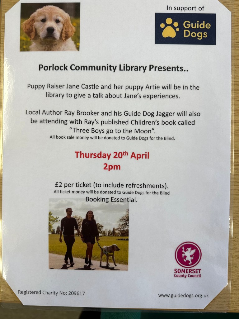 Jane Castle will be giving a talk at Porlock Community Library next Thursday, in aid of Guide Dogs for the Blind.