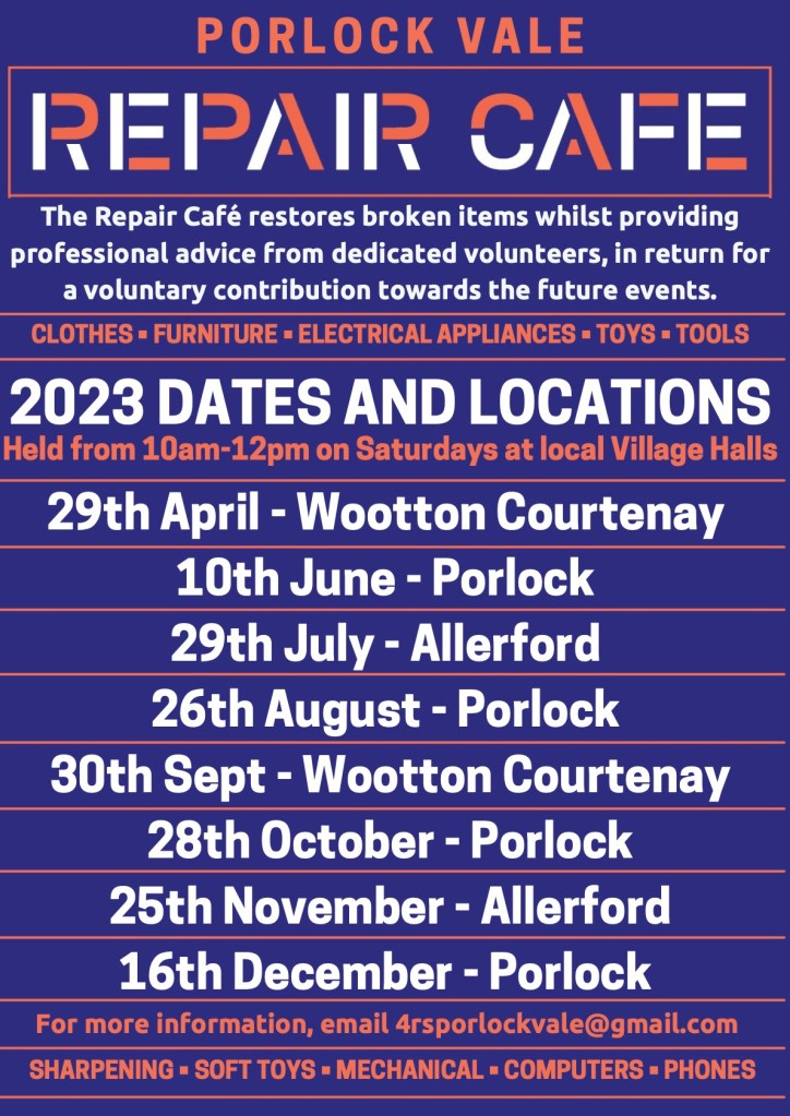 Repair Cafe Diary of Events The Repair Cafe is coming to Wootton Courtenay this Saturday. See below for the full programme. Share this: Click to email a link to a friend (Opens in new window) Email Click to share on Facebook (Opens in new window) Facebook Click to print (Opens in new window) Print More Click to share on X (Opens in new window) X Click to share on WhatsApp (Opens in new window) WhatsApp Click to share on Pinterest (Opens in new window) Pinterest Click to share on LinkedIn (Opens in new window) LinkedIn Click to share on Reddit (Opens in new window) Reddit Click to share on Pocket (Opens in new window) Pocket Related Published by Marion Jay View all posts by Marion Jay