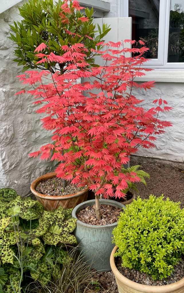 The photos below are mainly how it looks at the moment with its red foliage, but I’ve included an image showing the leaf colour in summer, too.