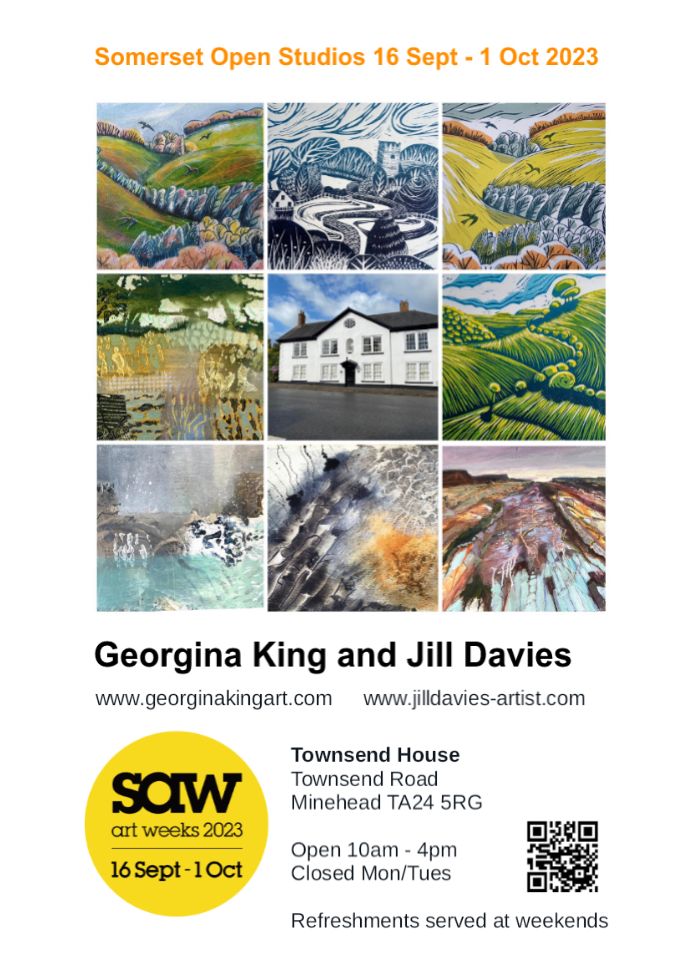 Talented Exmoor artists Georgina King and Jill Davies are delighted to be exhibiting at Townsend House (venue 67) for Somerset Art Weeks, from September 16th to 1st October. This beautiful 16th century house in the centre of Minehead is being brought to life with the vibrant colour, texture and rhythms of Exmoor which both artists portray so passionately in their paintings and prints. There will be an opportunity to wander in the charming walled gardens, and tea and cake will be served in this historic venue at weekends.