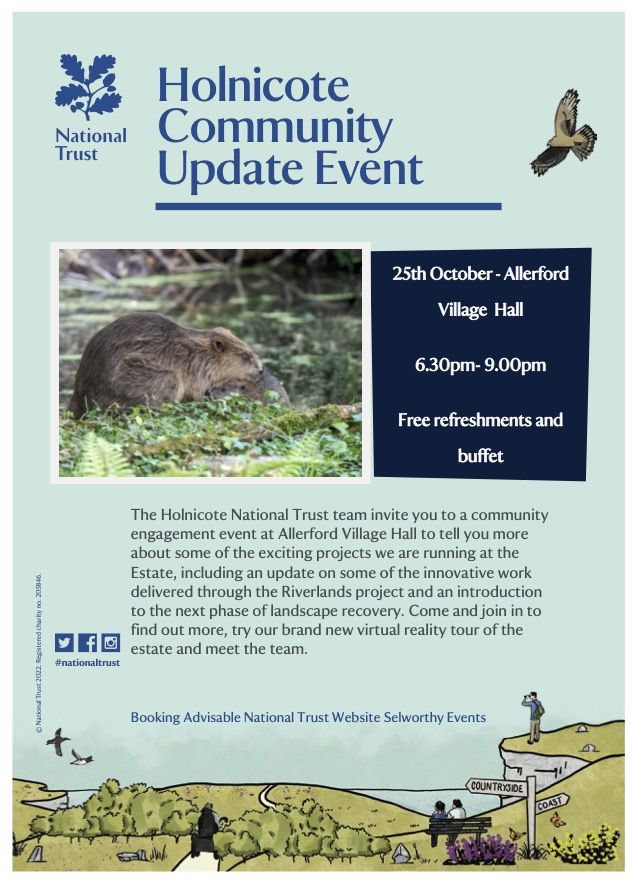 The Holnicote team are organising an engagement event to update members of the local community on the work we’ve been carrying out this year. During the evening we will provide updates on the projects being run across the estate, as well as brief introduction to the landscape recovery scheme and beaver release in the region (flyer attached). It would be great if you were able to join us at Allerford Village Hall on 25th October, 6:30pm – 9:00pm. There will be free refreshments and a buffet. Booking is advisable.