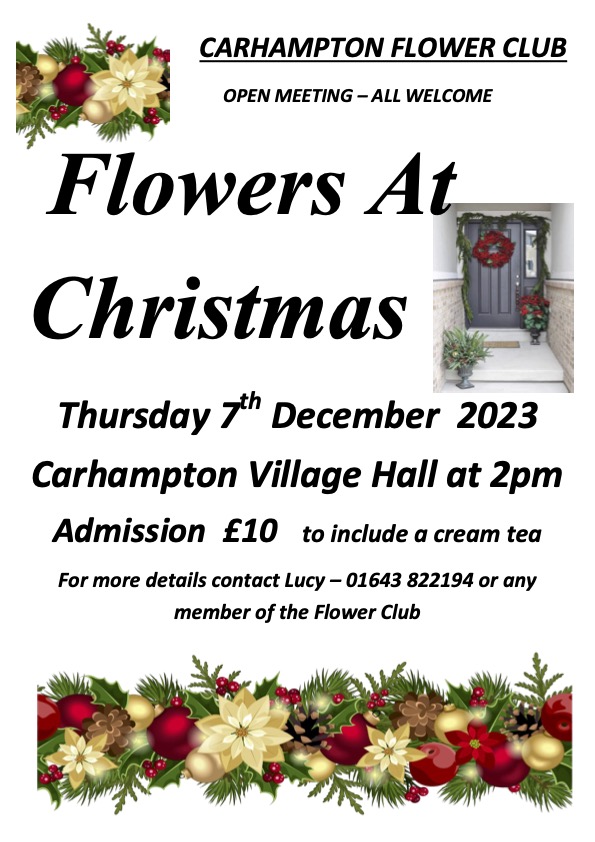 Carhampton Flower Club are having a Christmas Flower Arranging Demonstration on Thursday 7th December from 2pm. Please pass the word around to all your flower arranging enthusiasts, as it is usually a good afternoon and the demonstration will be followed by a cream tea. The flowers from the demonstration are raffled off at the end of the afternoon and a raffle ticket is included with the entrance money.