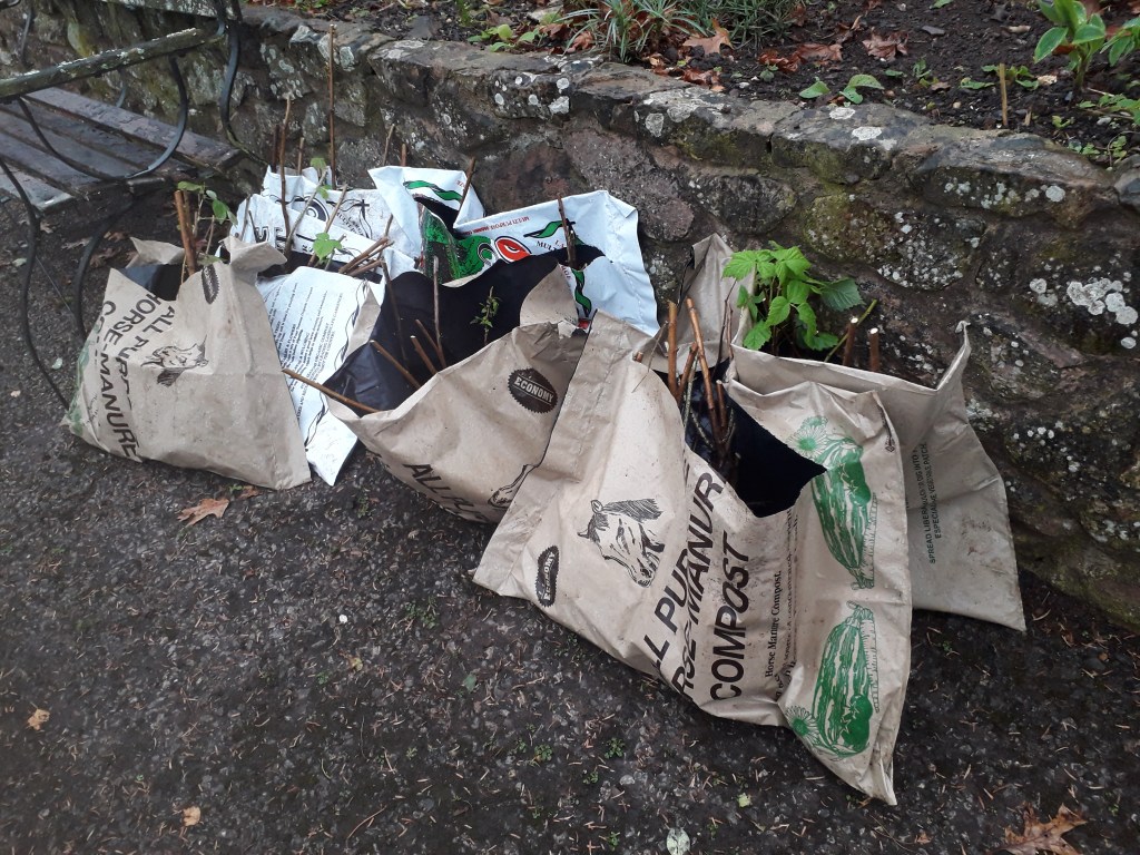 Due to accessibility issues we are thinning the raspberry patch here at Dunkery Pleck, so there are several bags of bare(ish) root plants available if anybody would like some. Pick & mix, the bags are in the drive near what’s left of an old bench (see photo below). Please help yourself. These are autumn raspberries – prune them right down in winter for late summer lusciousness! This is an ongoing project, so there will be more in the future if you miss out this time.