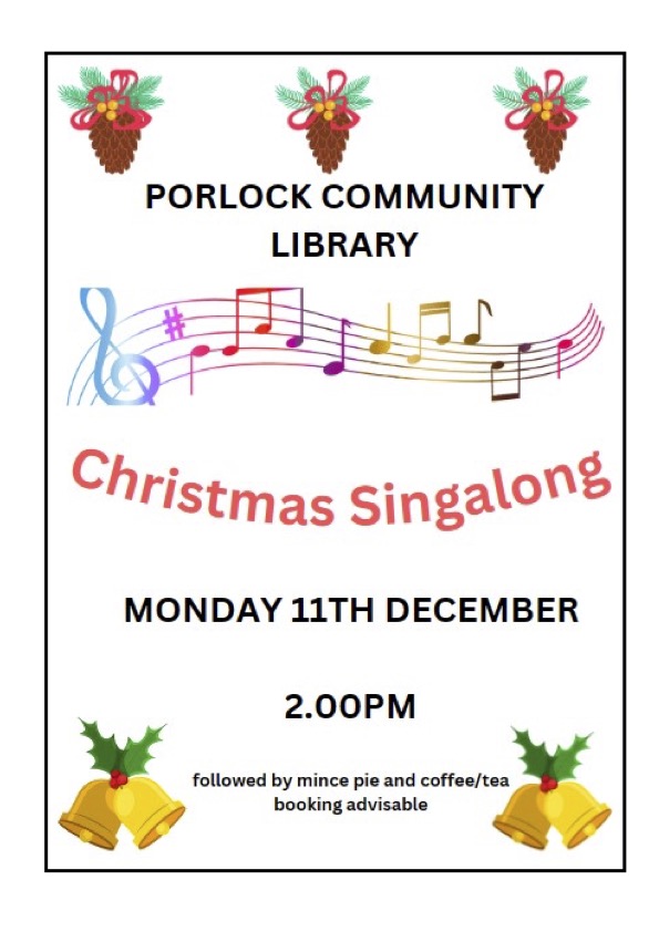 Christmas Singalong in Porlock Community Library on Monday 11th December at 2pm. Come and join in: followed by mince pies! Booking advisable: by phone 01643 862763, or email porlib@somerset.gov.uk, or be radical and just drop in the library!