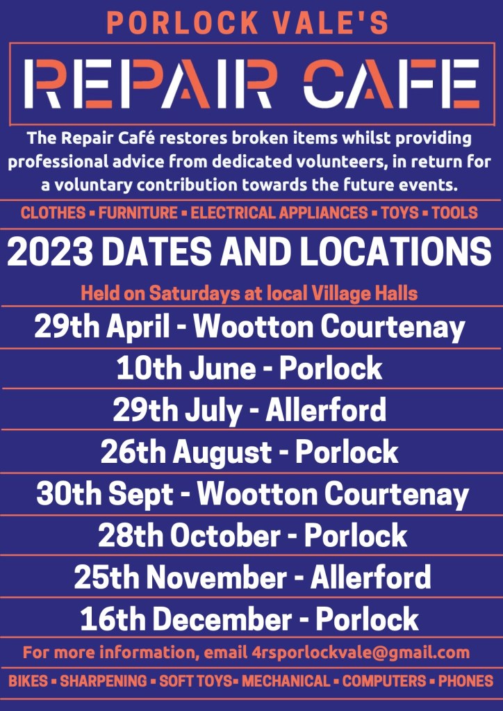 The Repair Cafe in Porlock on the 16th December will be your last chance to get that wonky item fixed before your guests arrive for Christmas. Don’t miss it!