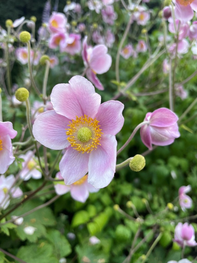 Anemone japonica (Japanese anemone) in delicate pink (see photo below).