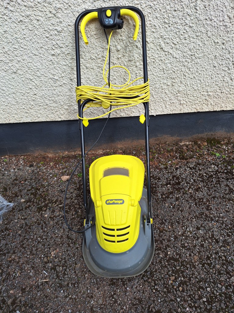 Challenge electric hover mower. Ideal for small areas and awkward edges. Only used for one season, collects the grass and comes with spare blades. See photos below. A snip at £20.