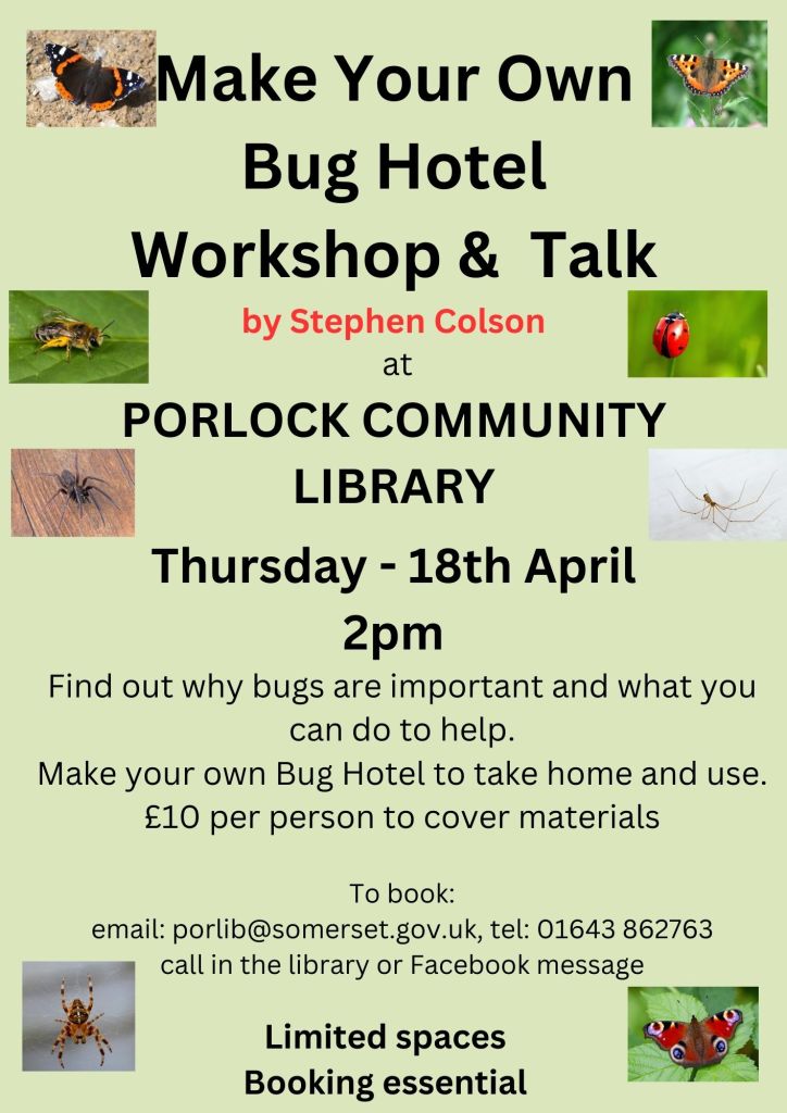 On 18th April, in Porlock Community Library at 2pm, there will be a short talk about the importance of insects in the environment, then a chance to make a your own ‘bug’ hotel.