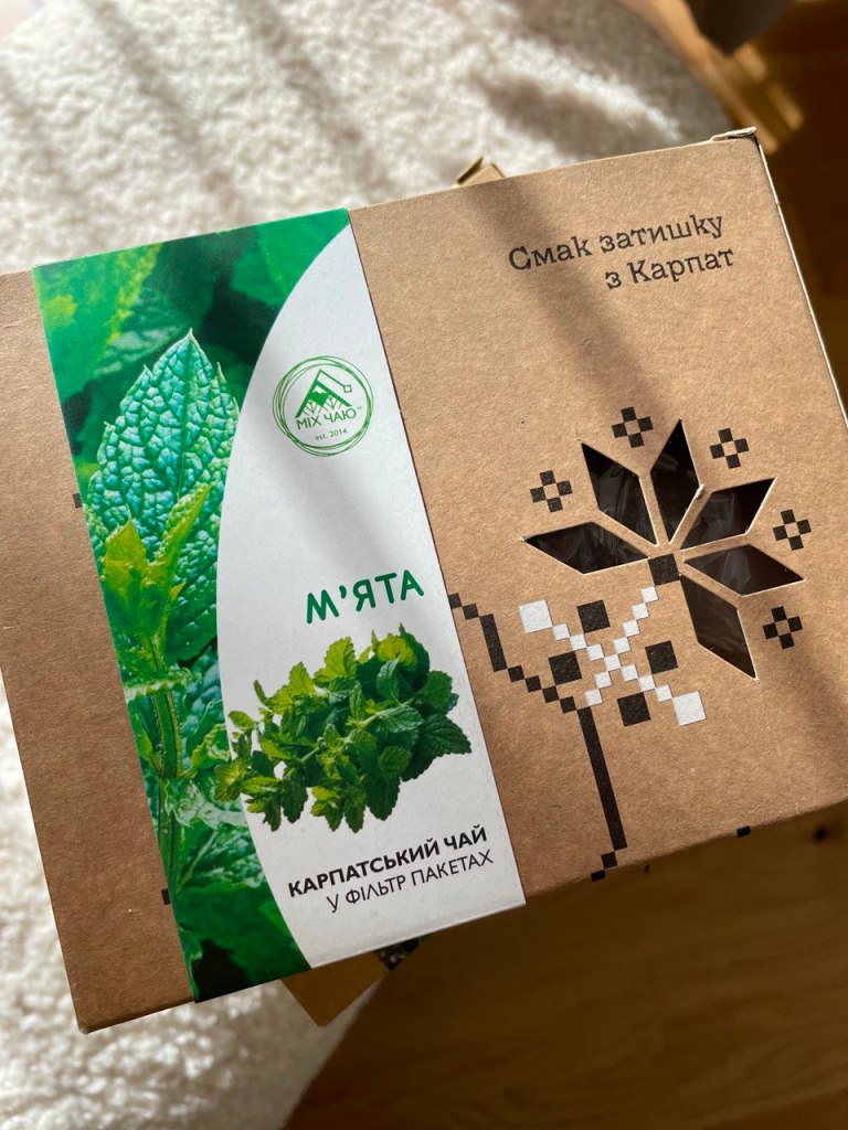 - Mint (green box): Exactly what it says, mint tea from the Ukraine. (https://mix-chayu.com.ua/product/m-yata/)