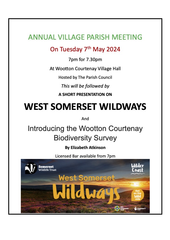 The Annual Parish Meeting is being held tonight (Tuesday) in the Village Hall. The evening will include a talk from the West Somerset Wildlife Trust, and an introduction to the Wootton Courtenay Biodiversity Survey by Ruth Walker.