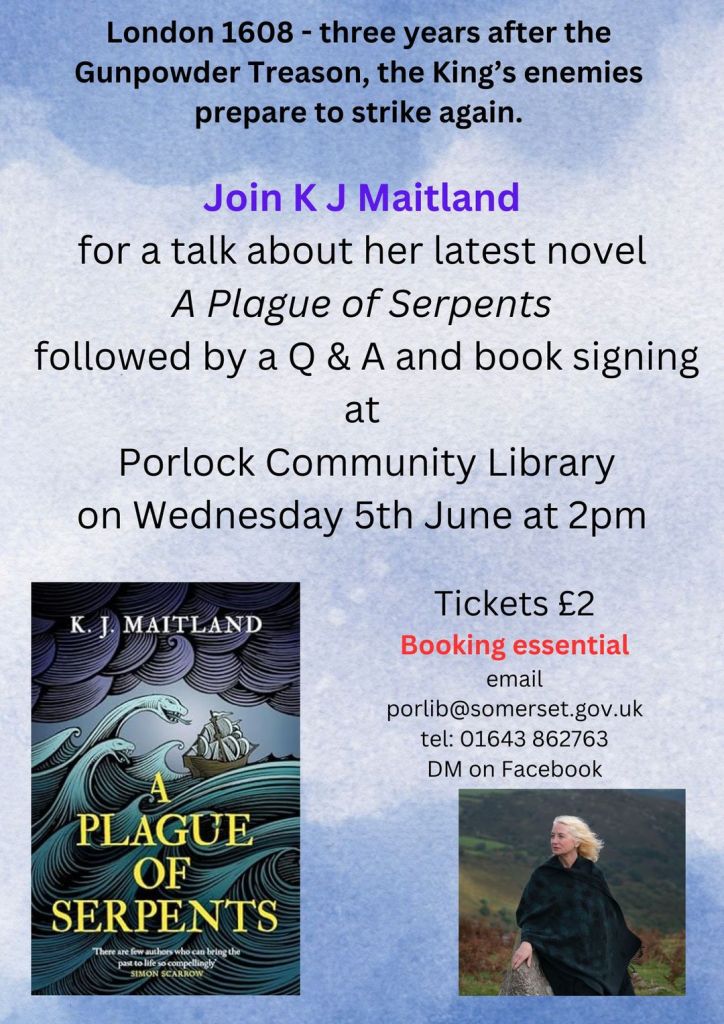 KJ Maitland, a well-known author of historical fiction, makes a welcome return to Porlock Community Library on Wednesday, 5th June, to talk about her latest book, answer questions and sign copies. Booking is essential. See poster below for details.
