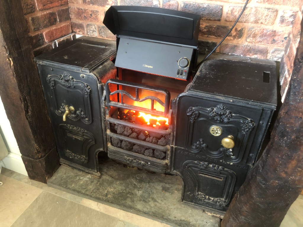 Victorian style cast iron range by James & Ware of Bristol fitted with Dimplex coal-effect electric fire with fan heater (see photo below). 70cm high x 108cm wide x 43cm deep.