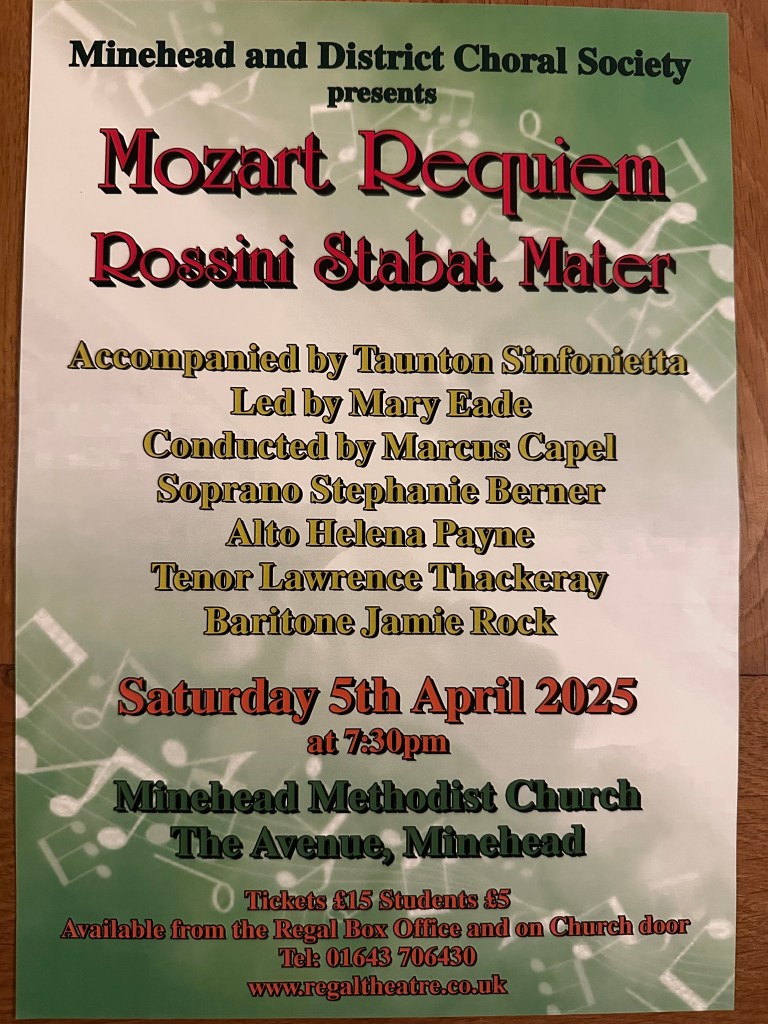 I am delighted to welcome members of the former Taunton Sinfonietta in joining Minehead & District Choral Society for this concert, as they have done for numerous concerts over the past 17 years. The performance will consist of two great choral works; Rossini’s Stabat Mater and Mozart’s Requiem. Personal favourites of mine, these works complement and contrast with each other, presenting challenges to the choir, soloists and orchestra alike whilst lifting spirits and allowing us all to enjoy an evening with the masters.