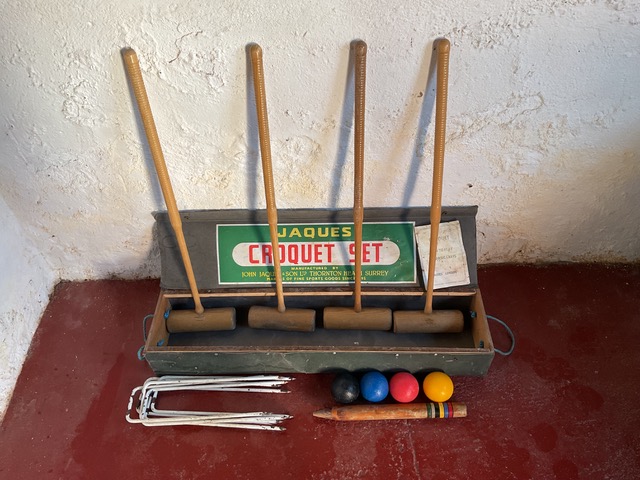 4 Corrigrip Ash Mallets, 37.5”. 4 coloured balls 12oz, 90mm diameter. 6 hoops and 1 winning post. A very old rulebook and a wood/cardboard carrying box.
