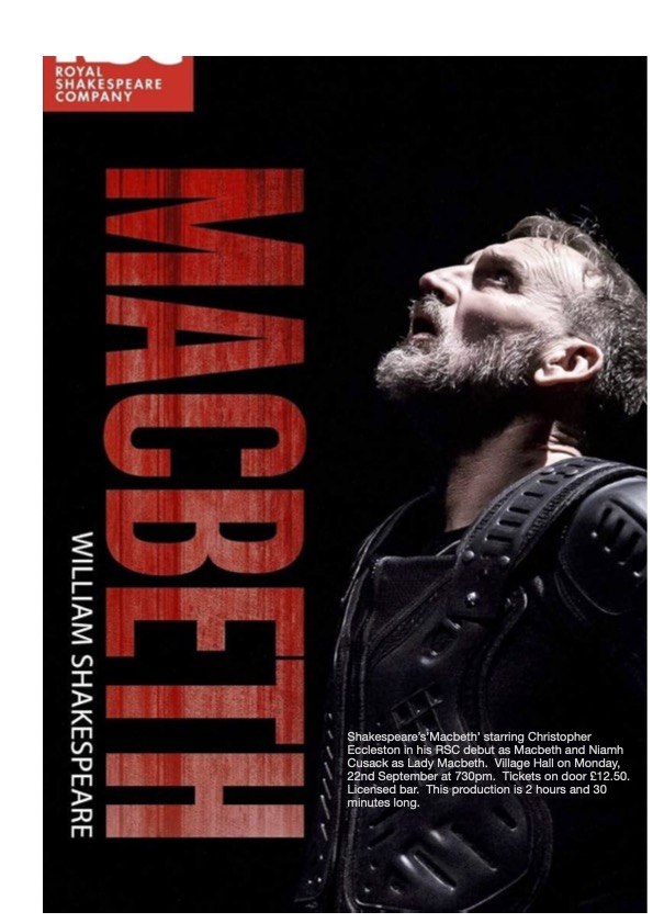 The next screening by the Theatre Club is on Monday, 22nd September at the village hall, Wootton Courtenay, when we will be showing the RSC’s 2018 production of ‘Macbeth’, starring Christopher Eccleston and Niamh Cusack. The film will start at 7.30pm, bar from 7pm.