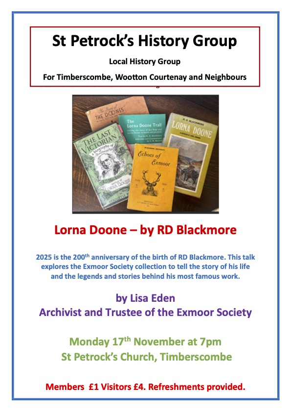 A reminder that Lisa Eden will be giving a talk on the life and work of the author RD Blackmore, including the ideas which inspired his classic novel ‘Lorna Doone’, next Monday evening at St Petrock’s Church in Timberscombe.