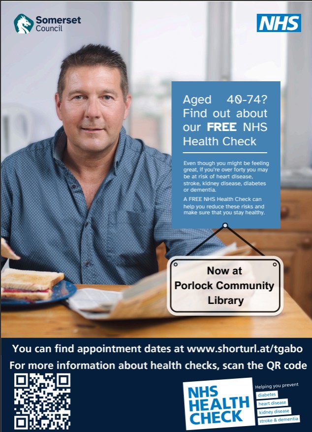 NHS health checks can now be carried out at Porlock Community Library by a health practitioner. Please see poster below for details.