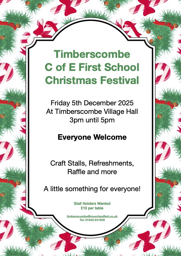Timberscombe First School are hosting their Christmas Fayre again this year (see poster below). The money raised will go to Friends of Timberscombe First School, who support the school with funds towards activities, equipment and resources. This year we are hoping to purcahse new PE equipment and musical instruments for the children. There will be a selection of local independent stalls, tea and coffee, a cake stall and a raffle. The Fayre is open from 3pm until 5pm with the children singing around the Christmas Tree outside the school from around 2.45pm. Do come along and join in the fun!