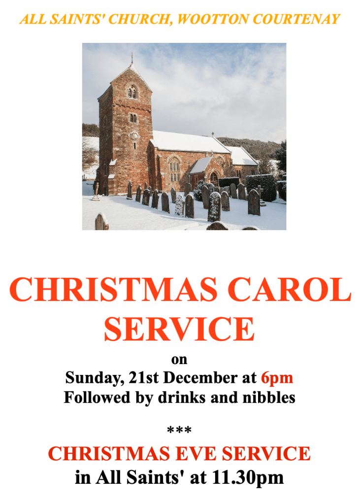 It’s Christmas! The Carol Service is here to prove it on Sunday, 21st December at 6pm in All Saints’ Church, Wootton Courtenay. I was asked why I always put ‘Wootton Courtenay’ and it’s because other All Saints’ are available!