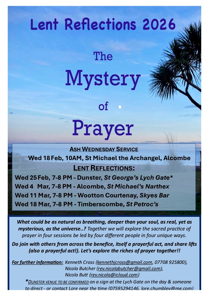 This year there will be a reflection for Lent in every parish of the Grabbist Hill Benefice, starting 25th February at 7pm in St George’s, Dunster. See poster below for more details.