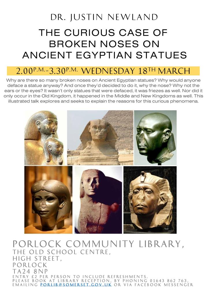 If you’ve ever wondered why the statues of ancient Egypt lost their noses, Justin Newland’s talk at Porlock Community Library on 18th March will answer your questions. Booking essential. See poster below for details.