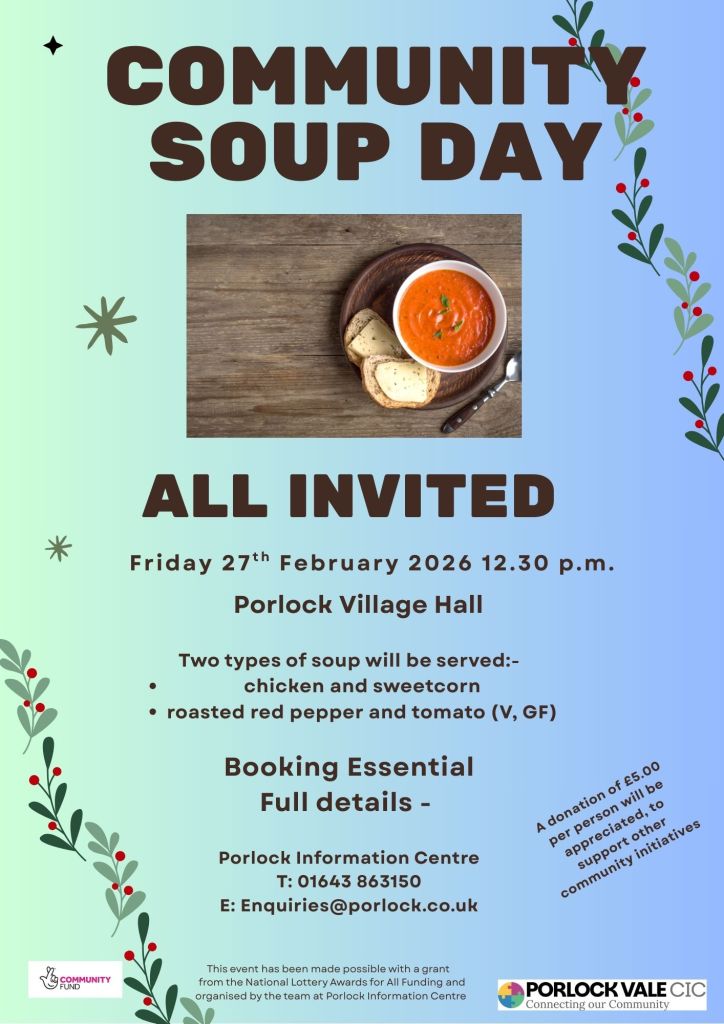 Porlock Information Centre invites you to join us at our Community Soup Lunch in Porlock Village Hall on Friday the 27th of February at 12:30pm. The Top Ship will be providing delicious chicken and sweetcorn soup and roasted red pepper and tomato soup; the roasted red pepper and tomato soup is vegan and both soups are gluten free. All will be served with bread rolls and butter. Our wonderful Porlock Ladies will be serving teas and coffees. We look forward to seeing you.