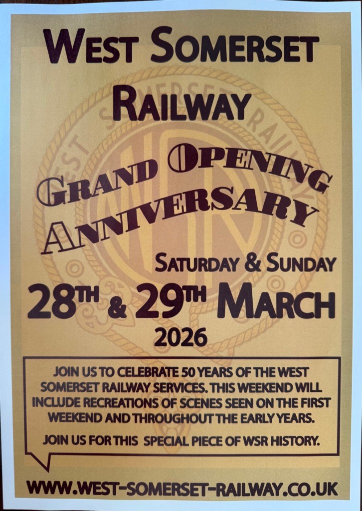 Over the weekend of 28th/29th March there will be a Grand Re-opening Anniversary event with numerous steam trains and heritage diesel trains running through glorious countryside along the entire 20 miles of the line from Minehead to Bishops Lydeard throughout the weekend.