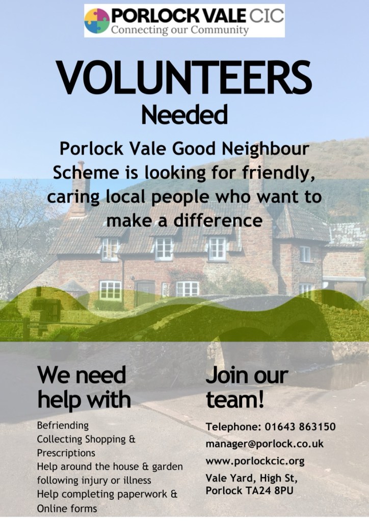 The Team at Porlock Information Centre have been working hard to get the Good Neighbour Scheme in place and we are very grateful to all who have offered to become a Good Neighbour to help support those who might need some short-term emergency help at home, or maybe some longer support. Thank you very much.