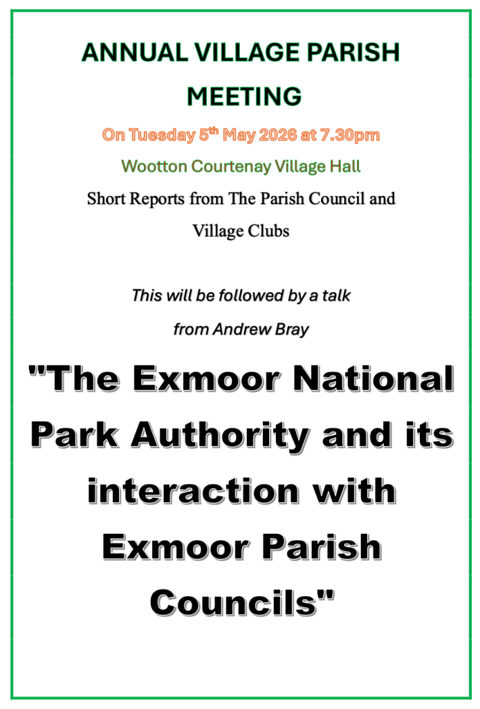 We are very lucky to have Andrew Bray, our village Parish Councillor, come to speak at the meeting as he is one of the elected Exmoor National Park Authority members who represents all the parishes of Exmoor on the main committee. He is on the Planning Committee, Final Accounts Committee, and the Exmoor Local Access Forum. He is also the Porlock Vale Parish Council representative on Somerset Council’s Local Network Forum. His talk will cover the role of the Exmoor National Park Authority and how parish councils work with the National Park on areas such as planning.