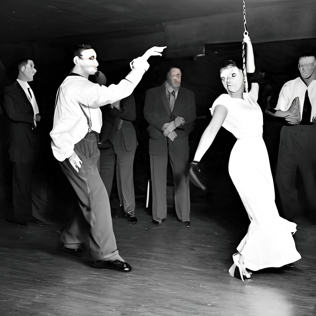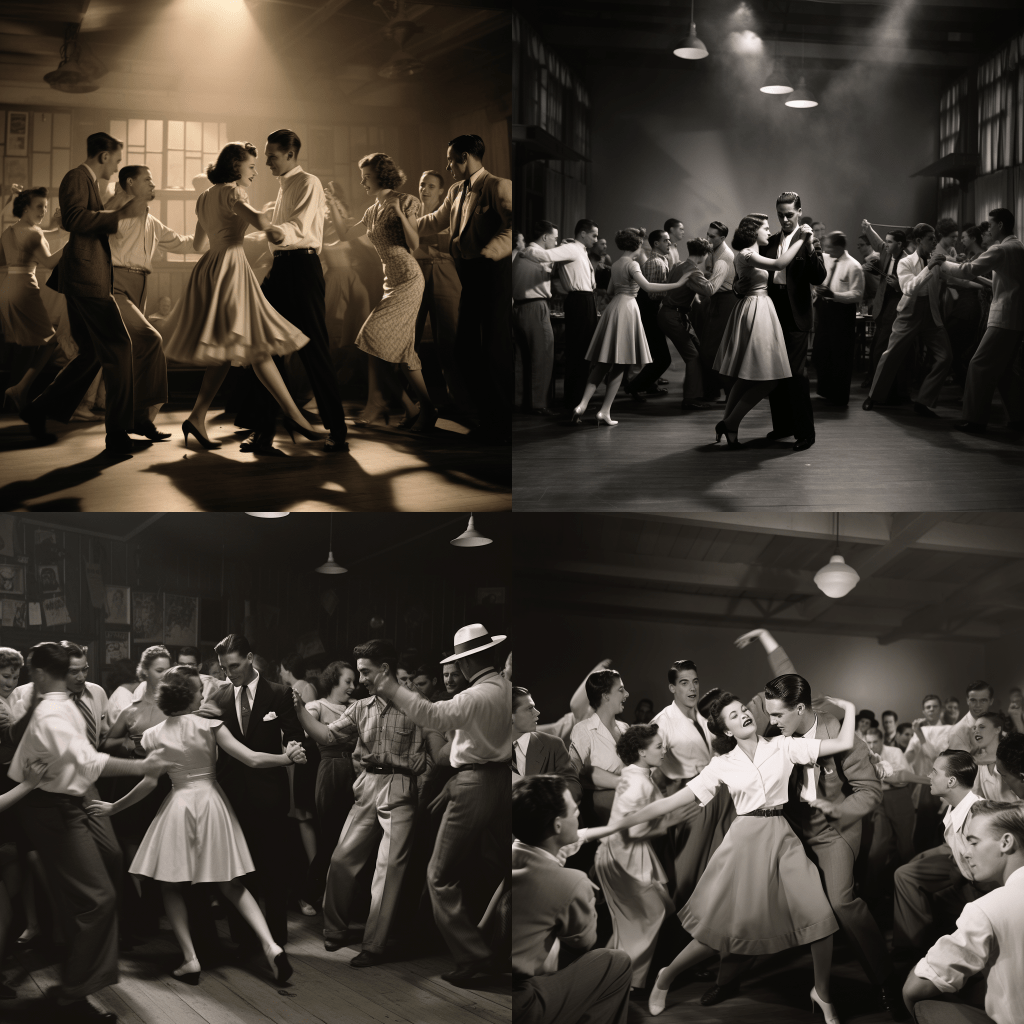 A swing dance in a village hall in a film noir style, with 20 men and women (MidJourney)